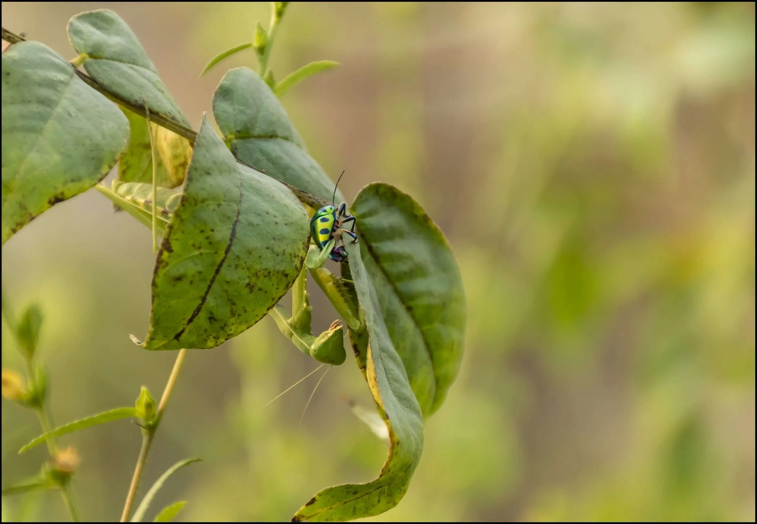 Peering in on the underside of the shrubbery, the scenario revealed itself, the bug crushed haplessly in the unforgiving forearms of a praying mantis, which was completely invisible to me a moment back… ‘twas too thorny to sit and watch the drama unfold, so on the haunches it had to be, with that eerie feeling of being completely unaware how many of its brethren surrounded me in these bushes…